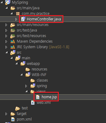처음 프로젝트를 만들게 되면 HomeController와 home.jsp가 생성되어 있습니다. (필요에 따라 지워도 상관없습니다.)