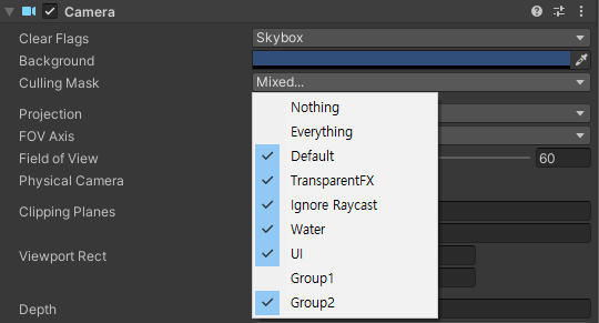 Group1을 체크 해제하는 순간 Culling Mask는 Everything -> Mixed가 되는 것을 볼 수 있으며