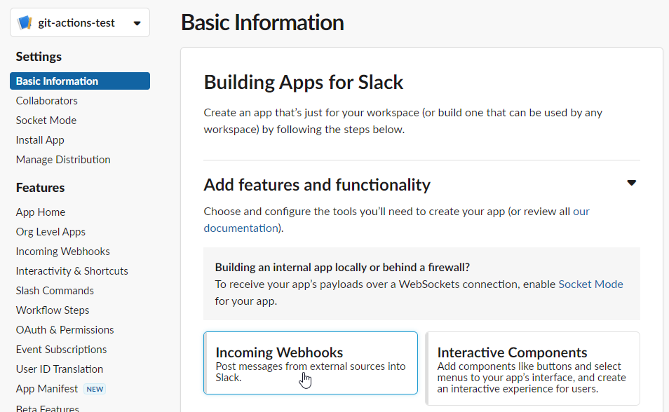 그리고 Settings -> Basic Information -> Add features and functionality에서 Incoming Webhooks를 누르고 활성화합니다.