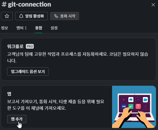 그 다음은 채널 우클릭 -> 채널 세부정보 보기 -> 통합 -> 앱 에서 앱 추가를 합니다.