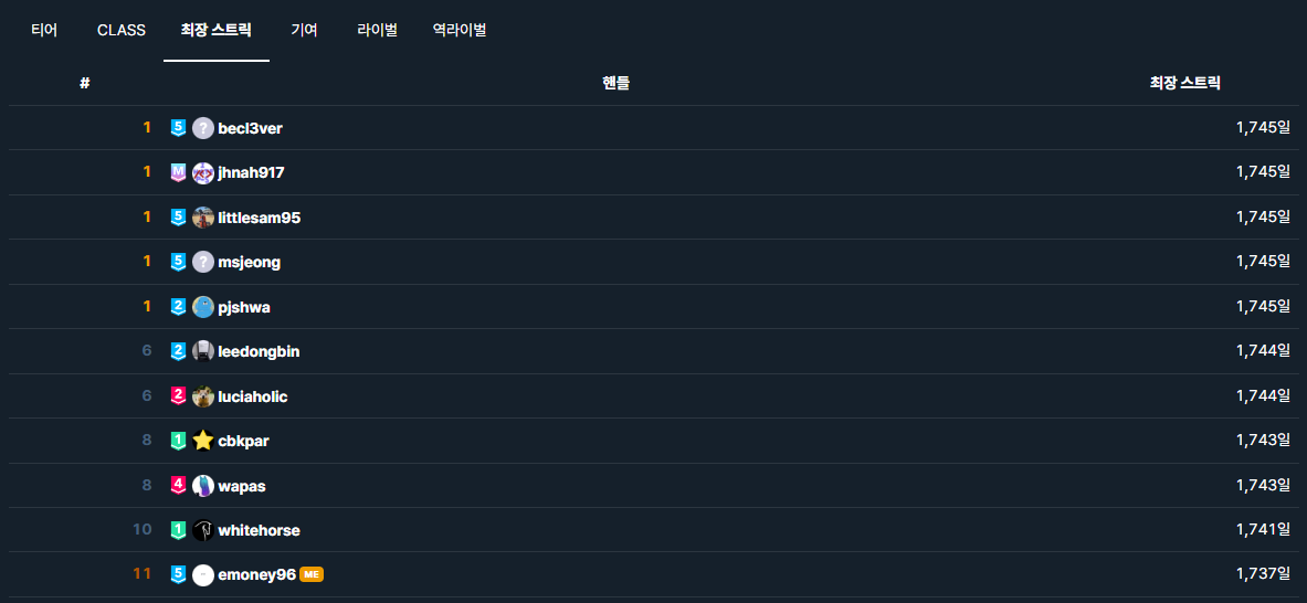최장 스트릭은 최종 11위로 마무리되었습니다.