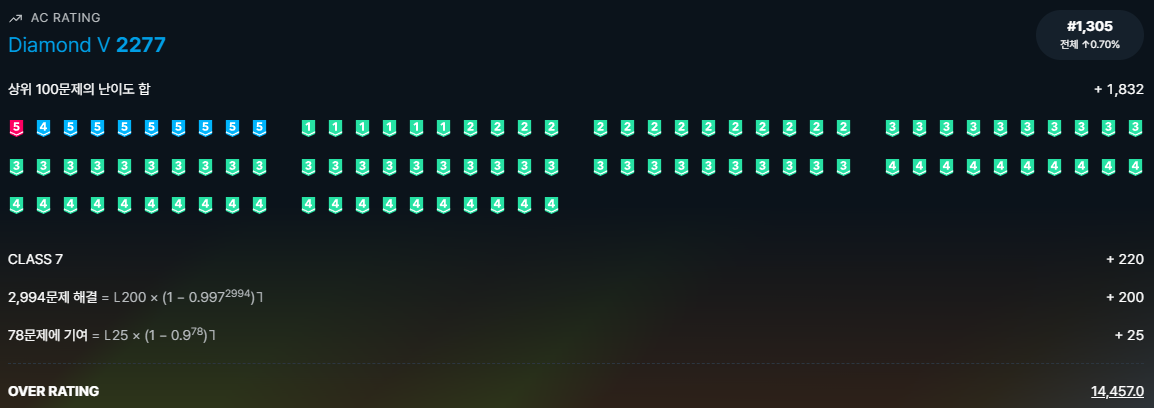 최종 티어는 다이아5 입니다. 루비도 한 문제 푼게 보이네요.