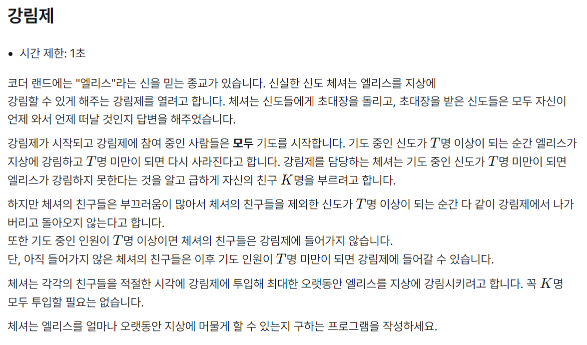 1, 2, 3, ...., K까지 하나씩 등장하도록 만들어야 하고, 이 때 K의 최댓값을 구하는 문제입니다.