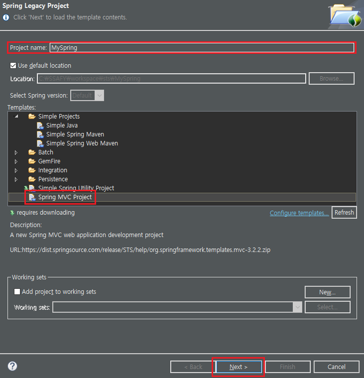 프로젝트 이름을 적어주시고, Templates는 Spring MVC Project를 선택하여 Next를 누르고,