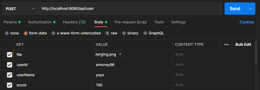 Key name은 @RequestPart 에서 value로 지정해준 name과 동일한 Key name으로 넣어줍니다.