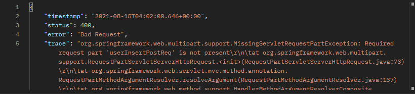 File과 Dto를 같이 받아올 때 Key name과 content type 설정을 잘못하여 나온 에러 상황이었습니다.
