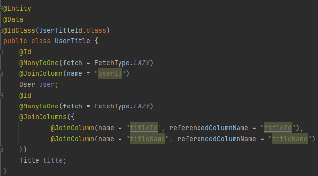이제 저는 User와 Title Entity의 N:N 관계를 UserTitle Entity로 구현할 생각이며, 각각 Entity의 key들을 외래 키이자 기본 키로 사용하려고 합니다.