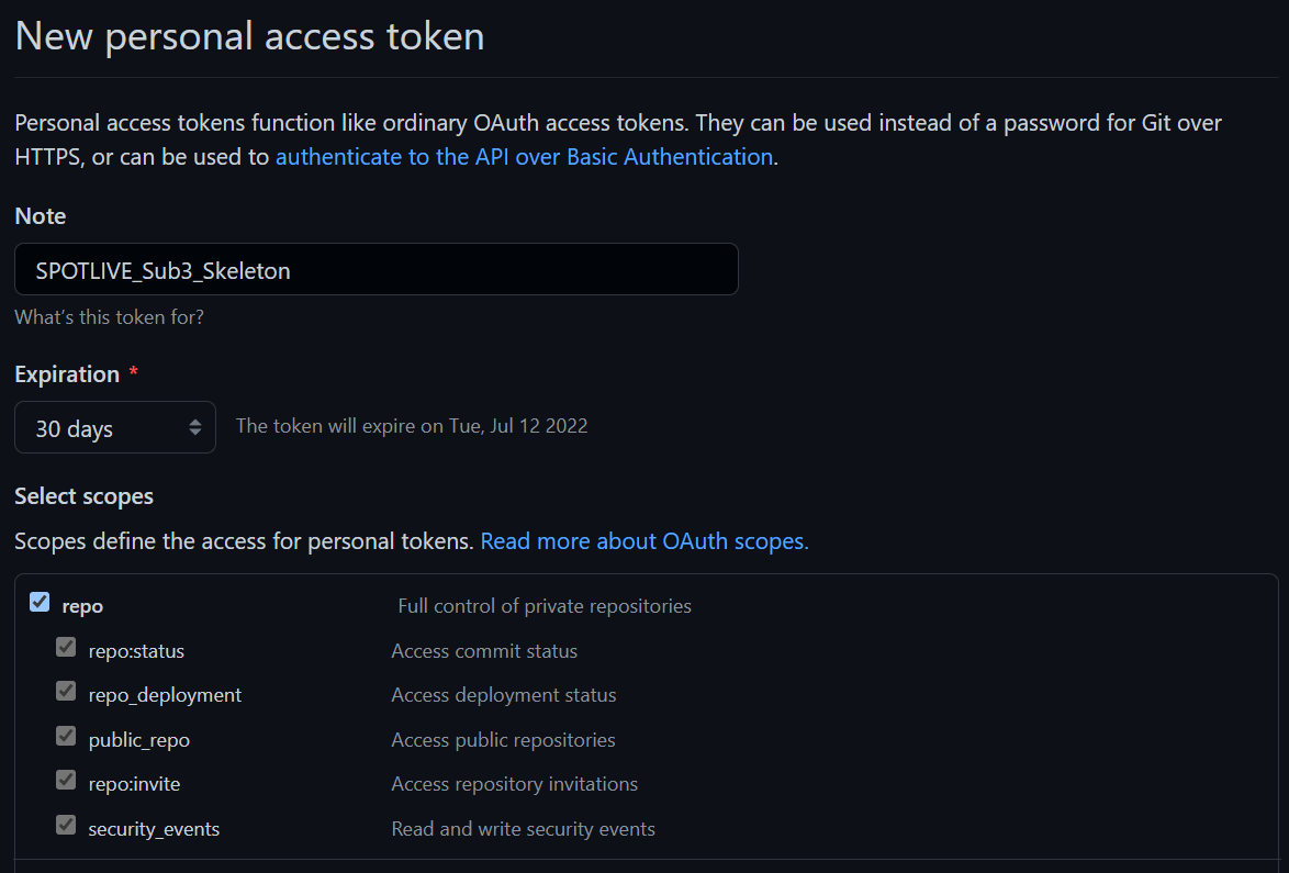 Note는 자유롭게 구분할 수 있도록 작성해주시고, scope는 repo만 체크를 합니다.