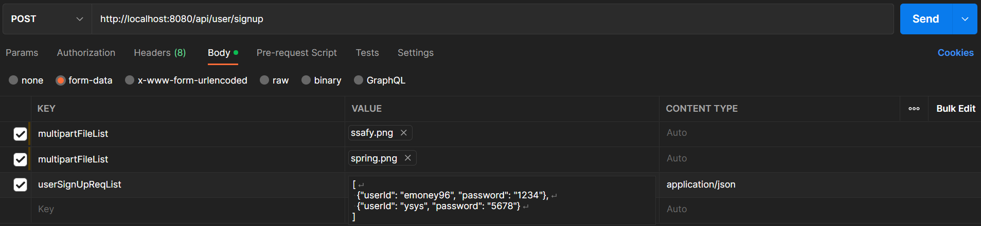 우선 단일 File, Dto 요청 시에는 Body -> form-data에서 File 업로드 및 Dto는 json 방식으로 작성하면 된다고 하였습니다.