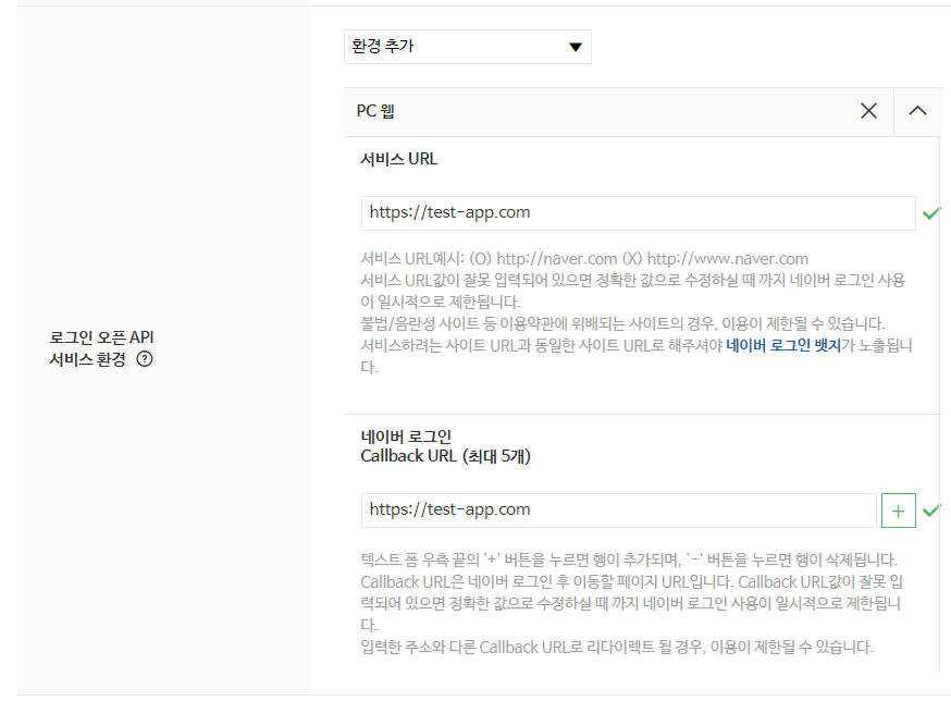 서비스 URL은 말 그대로 메인 URL이며, Callback URL은 로그인 성공 시 이동할 주소를 작성합니다.