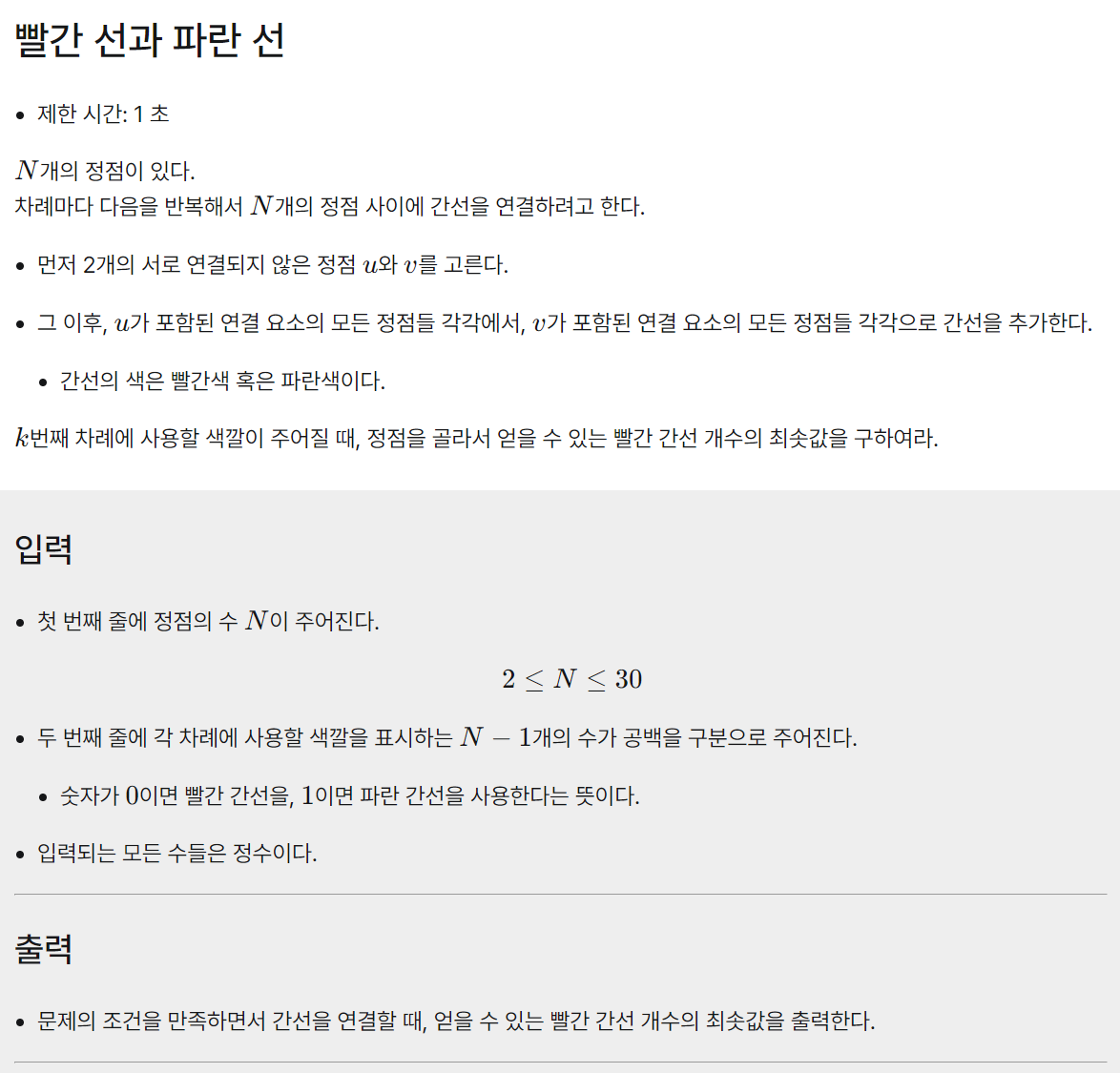 이때 사용되는 간선들 중 빨간 간선의 갯수가 최소가 되도록 정점을 적절하게 골라야 합니다.