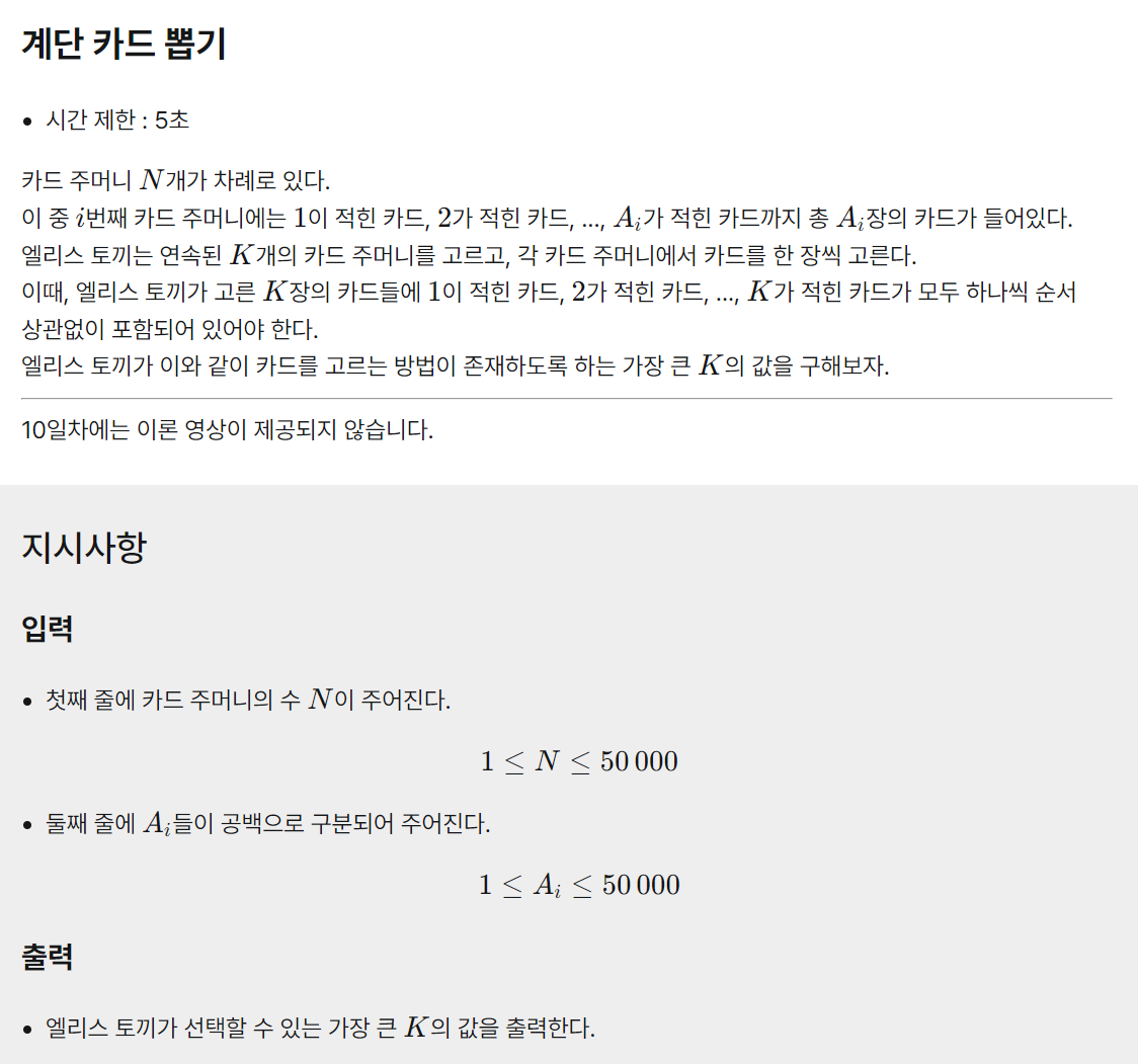 1, 2, 3, ...., K까지 하나씩 등장하도록 만들어야 하고, 이 때 K의 최댓값을 구하는 문제입니다.
