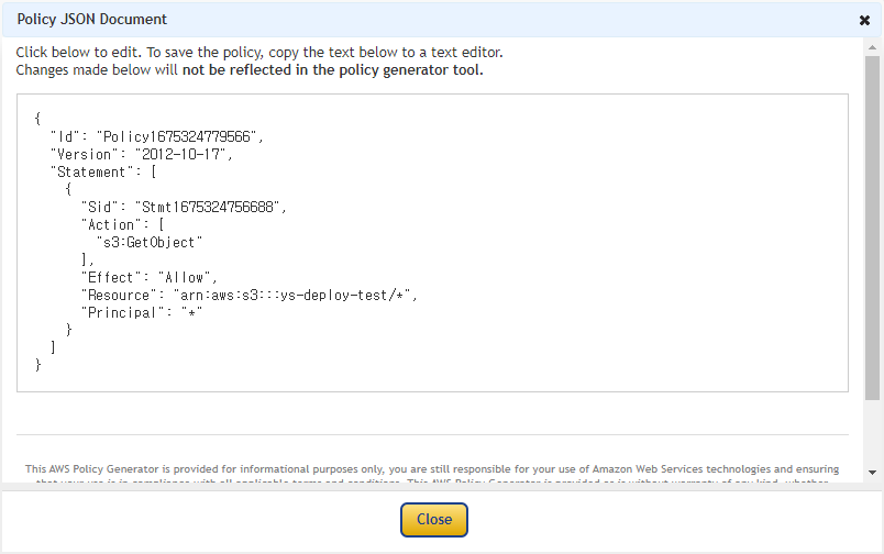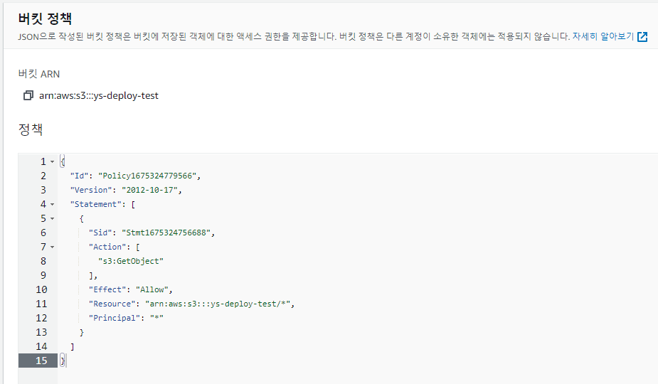 그리고 해당 S3로 넘어가서 버킷 -> 권한 -> 버킷 정책 -> 편집에서 해당 내용을 넣고 저장합니다.