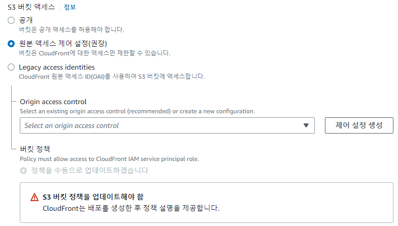 그리고 S3 버킷 액세스를 "원본 액세스 제어 설정"으로 변경합니다.