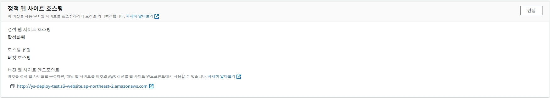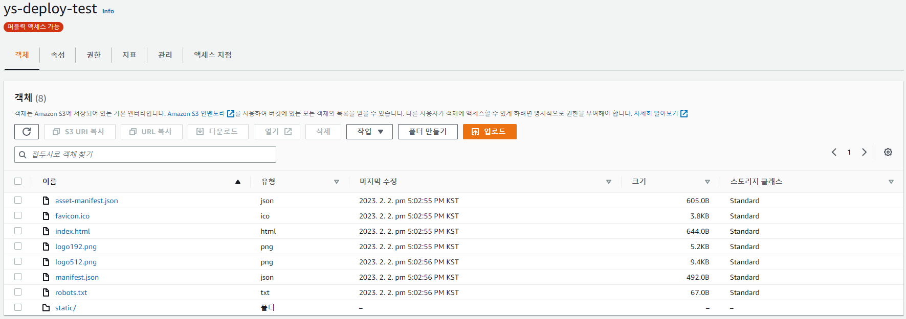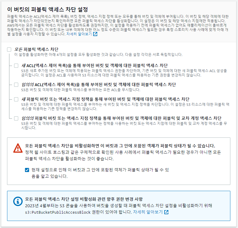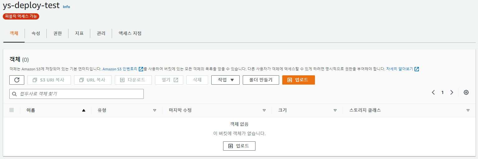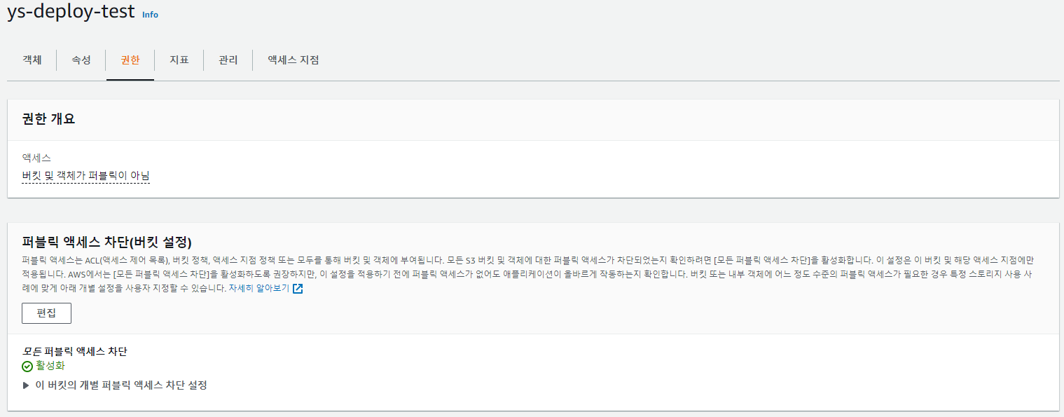 현재 S3만으로 배포가 완료된 이 버킷은 퍼블릭 상태이고, 퍼블릭 차단이 해제되어 있습니다.