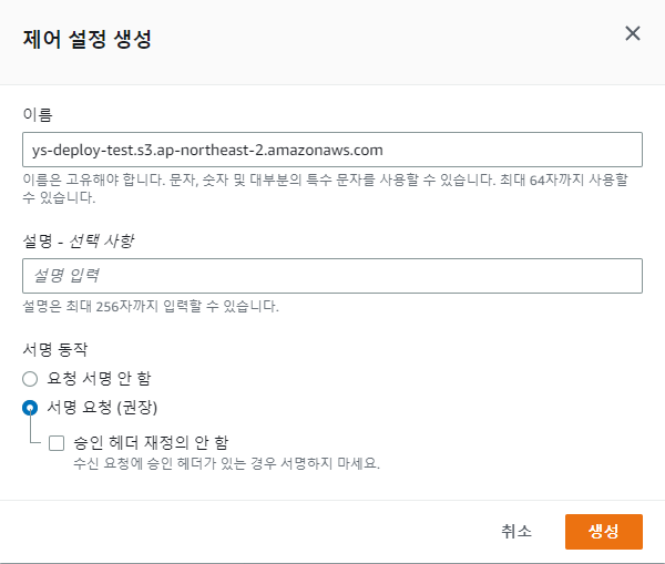 그 다음 제어 설정 생성을 눌러서 해당 S3의 제어 설정을 생성합니다.