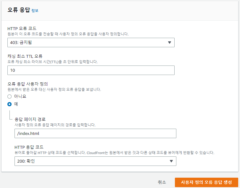 해당 배포 -> 오류 페이지 응답 생성에서 사용자 정의 오류 응답 생성 버튼을 누릅니다.